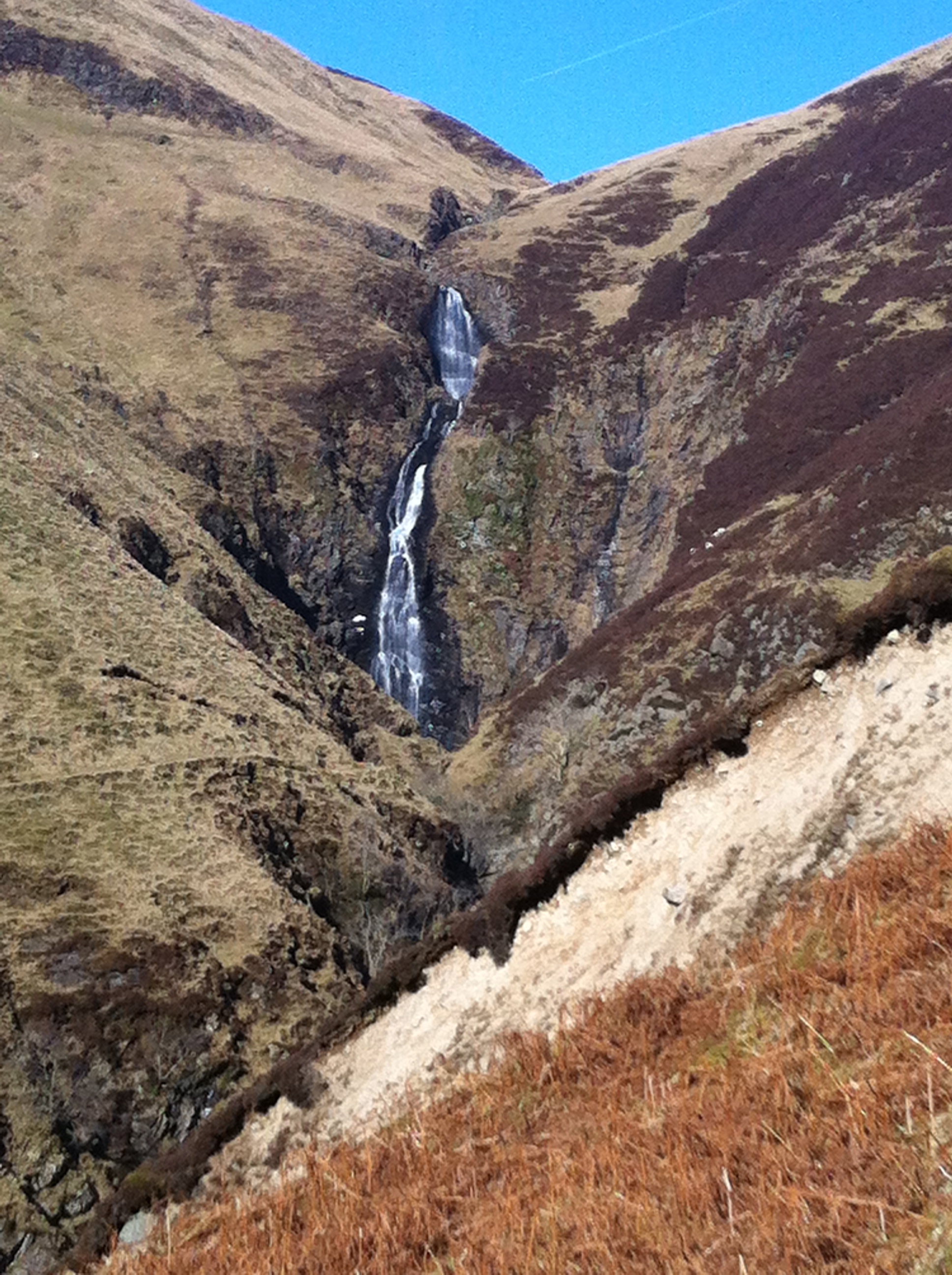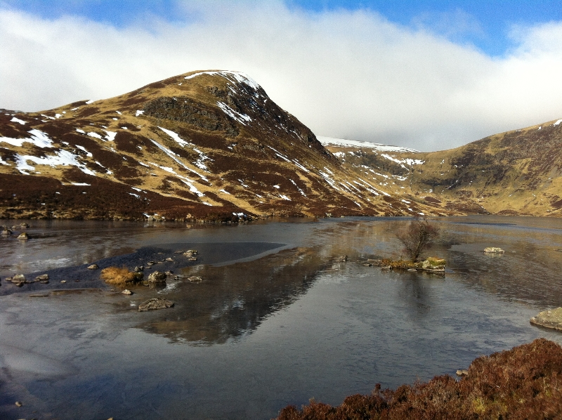 We started at The Grey Mare's Tail (waterfall) car park on the A708 road from Moffat to Selkirk, from where a path leads through crags to the summit. It was pretty steep! We went up the North slope so was still a few feet of snow as soon as we got pretty high. Total ascent was 750 m with the summit being on a flat grassy plain.